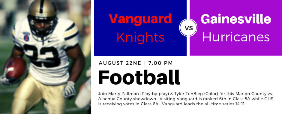 Join Marty Pallman (Play-by-play) & Tyler TenBieg (Color) for this Marion County vs. Alachua County showdown. Visiting Vanguard is ranked 6th in Class 5A while GHS is receiving votes in Class 6A. Vanguard leads the all-time series 14-11.